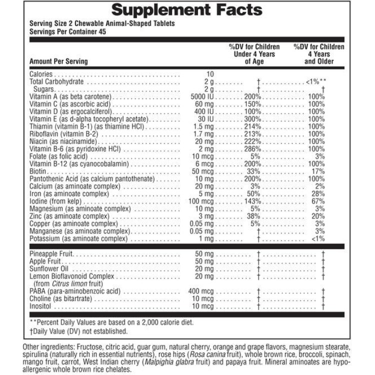 Κάθε μασώμενη ταμπλέτα περιέχει 16 βιταμίνες, 8 μέταλλα και πλήθος υγιεινές τροφές: σπανάκι, μπρόκολο, καρότο, σπιρουλίνα, παπάγια, μήλο, καρπούς τριαντάφυλλου κ.ά. Υποαλλεργικές ταμπλέτες με θαυμάσια γεύση και απίθανα σχήματα ζώων: λιοντάρια, ελέφαντες, τίγρεις, ιπποπόταμοι κλπ. Υποαλλεργική.