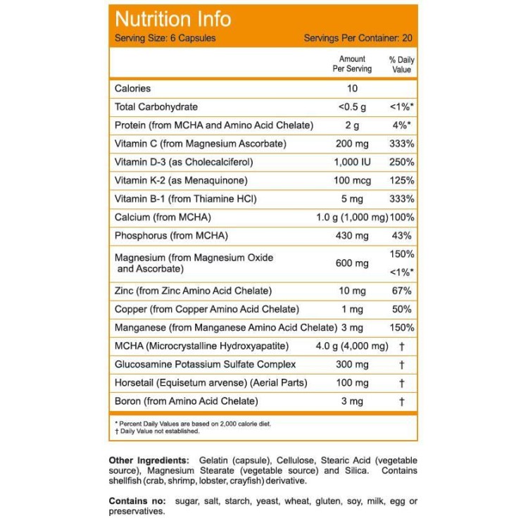 Το Now® Bone Strength παρέχει 1000 mg από Calcium Hydroxyapatite, μια πό τις πιο απορροφήσιμες και αποτελεσματικές μορφές ασβεστίου. Επίσης περιέχει 4000 mg από Mycrocrystalline Hydroxyapatite (MCHA), ένα φυσικό συστατικό το οποίο βοηθά στη διατήρηση της σωστής δομής των οστών και προστατεύει την οστεϊκή μάζα και πυκνότητα.