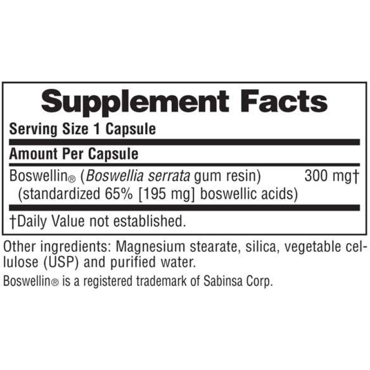 Κάθε φυτική κάψουλα περιέχει 300 mg τιτλοδοτημένο εκχύλισμα Boswellin (Boswellia serrata), περιεκτικότητας 65% (195 mg) σε boswellic acids.