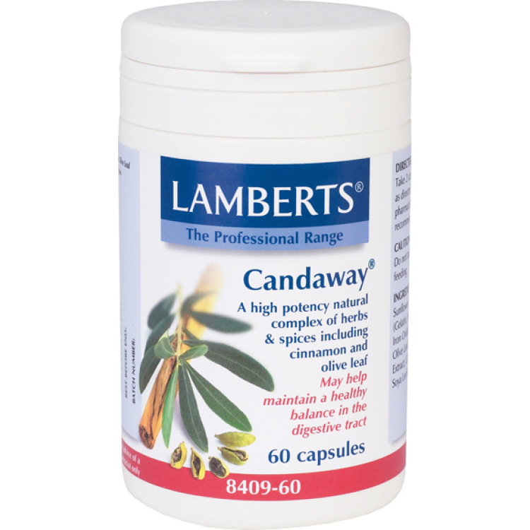 Tο Candaway αποτελεί μια μοναδική, υψηλής ισχύος φόρμουλα που περιέχει φλούδα από κανέλλα σε συνδυασμό με φύλλα ελιάς, σπόρο από μάραθο και ρίγανη, συστατικά τα οποία εμφανίζουν αντιμυκητιασική δράση (αναστολή ανάπτυξης της Candida Albicans).