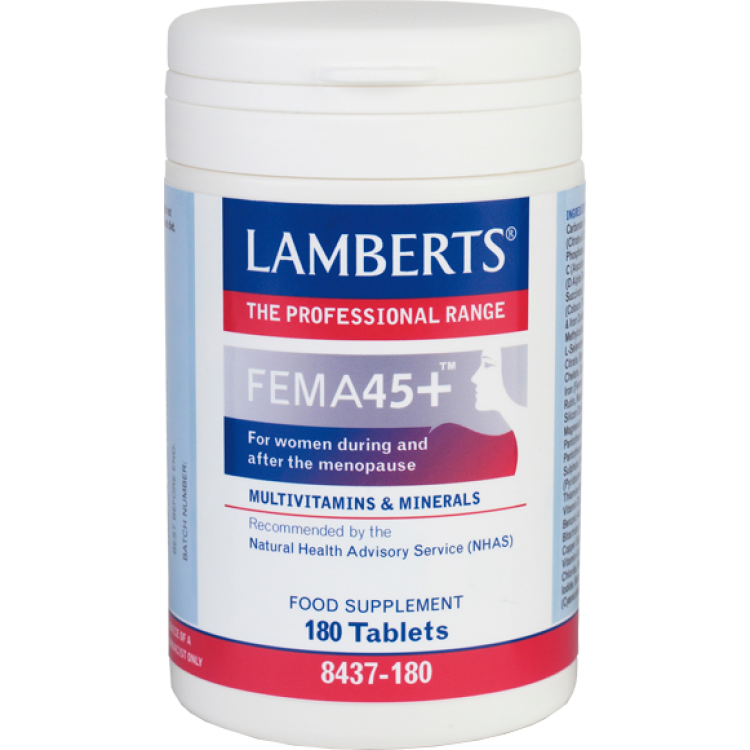 Η LAMBERTS λαμβάνοντας υπόψη τις ιδιαίτερες διατροφικές ανάγκες του γυναικείου οργανισμού κατά την περίοδο της εμμηνόπαυσης, σχεδίασε μια μοναδική πολυβιταμινούχο φόρμουλα για τις γυναίκες αυτής της ηλικίας, την Fema 45+.Υπεύθυνος σχεδιασμού της Fema 45+είναι η Marion Stewart, διαιτολόγος διατροφολόγος του Natural Health Advisory Service (Συμβουλευτική Υπηρεσία του Συστήματος Υγείας στο Ηνωμένο Βασίλειο). Η Fema 45+. παρέχει σε ικανοποιητικά επίπεδα 28 μικροθρεπτικά συστατικά συμπεριλαμβάνοντας μεγάλο αριθμό ιχνοστοιχείων και αντιοξειδωτικών. Στοχεύοντας στην υγεία των οστών περιέχει επίσης πολύ καλά επίπεδα μαγνησίου , ασβεστίου καθώς και βιταμίνες D και K. Επιπροσθέτως περιλαμβάνονται σε σημαντικές ποσότητες οι βιταμίνες του συμπλέγματος B, οι οποίες είναι γνωστό ότι συμμετέχουν σε μεταβολικές αντιδράσεις παραγωγής ενέργειας. Ανακεφαλαιώνοντας: η Fema 45+ αποτελεί μια εξαιρετική πολυβιταμινούχο φόρμουλα που εμπεριέχει όλα τα απαραίτητα θρεπτικά συστατικά για γυναίκες άνω των 45 ετών, σε δόση της μιας ταμπλέτας ημερησίως ενισχυμένη: