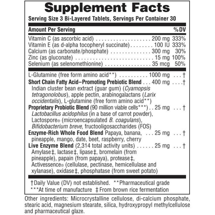 Μοναδική φόρμουλα για την υγιή λειτουργία του πεπτικού συστήματος. Παρέχει φυσικά συστατικά [βιταμίνες C & E, μέταλλα (ασβέστιο, ψευδάργυρο, σελήνιο), γλουταμίνη, φυτικά ένζυμα, προβιοτικά (L. acidophilus, B. coagulans, B. breve) και πρεβιοτικά (FOS, πηκτίνη μήλου, guar gum, ARA-Larix)] που βελτιώνουν την πέψη και την απορρόφηση και, παράλληλα, ενισχύουν τη δομή του γαστρεντερικού βλεννογόνου. Υποαλλεργικό προϊόν.