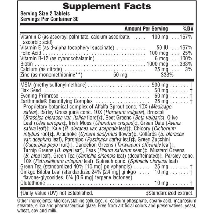 Φόρμουλα για την υγεία μαλλιών, δέρματος και νυχιών, με βιταμίνες, μέταλλα, MSM (methylsulfonylmethane), Flax seed, Evening Primrose, Green Tea, Ginkgo biloba, γλουταθειόνη και Earthmade Beautifying Complex (μίγμα 20 ειδικών βοτάνων). Υποαλλεργκό.