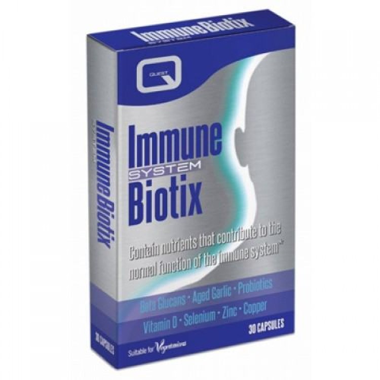 Το Immune Biotix της Quest είναι ένας μοναδικός συνδυασμός συστατικών που υποστηρίζουν το ανοσοποιητικό. Η μοναδική του σύνθεση περιλαμβάνει βήτα 1-3,1-6 γλυκάνες, σκόρδο, προβιοτικά, ψευδάργυρο, σελήνιο, χαλκό & βιταμίνη D. Οι βήτα 1-3,1-6 γλυκάνες είναι ισχυρά βιο-δραστικά συστατικά που μπορούν, σύμφωνα με μελέτες, να ενισχύσουν το ανοσοποιητικό σύστημα και να μειώσουν τον κίνδυνο ιώσεων και άλλων λοιμώξεων από παθογόνους μικροοργανισμούς. Το εκχύλισμα σκόρδου ψυχρής ωρίμανσης έχει αποδεδειγμένη αντιοξειδωτική και αντιμικροβιακή δράση. Ο ψευδάργυρος, το σελήνιο και ο χαλκός έχουν αντιοξειδωτική δράση, συμβάλλουν στην καλή λειτουργία του ανοσοποιητικού και μειώνουν τον κίνδυνο λοιμώξεων. Η βιταμίνη D υποστηρίζει επίσης το ανοσοποιητικό και τα προβιοτικά εμποδίζουν την εμφάνιση παθογόνων μικροοργανισμών στο σώμα. To Immune Biotix είναι ιδανικό για όσους θέλουν να ενισχύσουν το ανοσοποιητικό τους και να προστατευτούν από ιώσεις και άλλες λοιμώξεις, ειδικά κατά τους φθινοπωρινούς και χειμερινούς μήνες. Ιδανικό και για φιλάσθενα άτομα ή άτομα που έρχονται σε επαφή με πολύ κόσμο και παρουσιάζουν αυξημένο κίνδυνο να αρρωστήσουν.