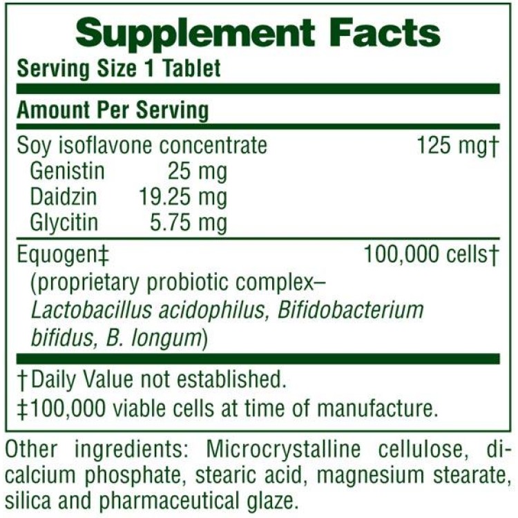 Κάθε ταμπλέτα περιέχει 125 mg ισοφλαβόνες από μη μεταλλαγμένη σόγια (non GMO), σε συνδυασμό με γαλακτοβάκιλλους (L. acidophilus, B. bifidum, B. longum) που εξυγιαίνουν το πεπτικό σύστημα και αυξάνουν κατά πολύ την απορρόφηση των ισοφλαβονών. Η ισχυρότατη αυτή φόρμουλα περιέχει Genistin, Daidzin και Glycitin στις αναλογίες που βρίσκονται στη σόγια.