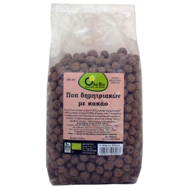 Συστατικά αλέυρι ρυζιού*(32%),αλέυρι καλαμποκιού*(18%),αλέυρι σταριού*(18%),ακατ.ζάχαρη*,σοκολάτα κουβερτούρα*(4,7%),σιρόπι καλαμποκιού*,κακάο σε σκόνη*,αποβουτυρωμένο κακάο σε σκόνη*,αλάτι,λεκιθίνη σόγιας. *= προιόν βιολογικής γεωργίας