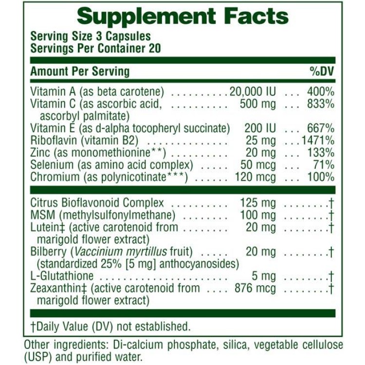 Προστασία των ματιών από τις εκφυλιστικές αλλοιώσεις των ελεύθερων ριζών, με λουτεΐνη (20 mg οι τρεις κάψουλες), ζεαξανθίνη, αντιοξειδωτικές βιταμίνες και μέταλλα, βιοφλαβονοειδή, MSM, Μύρτιλλο (Bilberry), Γλουταθειόνη. Υποαλλεργικό.