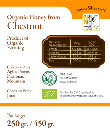Οι Καστανιές που σαν αρχόντισσες κυρίες υψώνονται μέσα στα δάση του Πάρνωνα, δίνουν στις μέλισσες την ευχαρίστηση να συλλέξουν το νέκταρ από τα άνθη τους, δημιουργώντας ένα εκλεκτό μέλι με δυνατό άρωμα, σκούρο καστανό χρώμα και μεστή υπόγλυκη γεύση. Είναι ιδιαίτερα θρεπτικό μέλι λόγω της μεγάλης περιεκτικότητας του σε γυρεόκκοκους και προσφέρει πνευματική διαύγεια. Διαθέτει εφιδρωτικές ιδιότητες, βοηθά στην κυκλοφορία του αίματος και στη λειτουργία του πεπτικού συστήματος. Συνιστάται σε προβλήματα προστάτη και γενικότερα ασθένειες του ουροποιητικού συστήματος. Η κρυστάλλωση του μελιού είναι φυσικό φαινόμενο που επαναφέρεται εάν τοποθετήσετε τη συσκευασία σε ζεστό νερό έως 50oC.