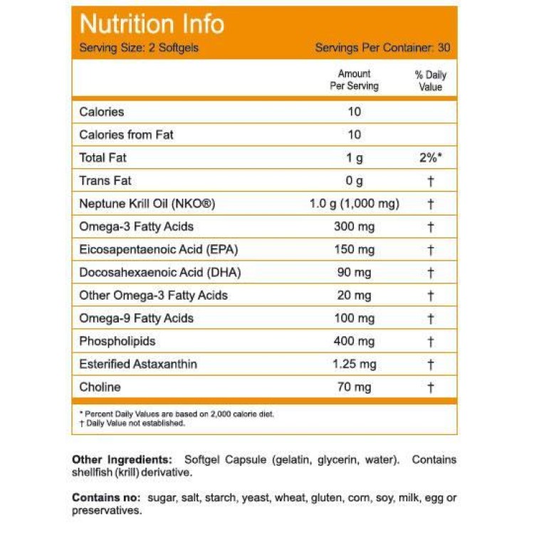 Το Neptune Krill Oil (NKO®) είναι γνωστό για το μοναδικό του προφίλ ως λιπαρό οξύ (FA), καθώς και για το πλούσιο περιεχόμενό του σε αντιοξειδωτικά. Η ισορροπημένη περιεκτικότητα του ΝKO ® σε λιπαρά οξέα δεν περιλαμβάνει μόνο EPA και DHA, το κρίσιμο Ωμέγα-3 FA, αλλά και Ωμέγα-9 FA όπως επίσης και φωσφολιπίδια. Το NKO® είναι μια πλούσια πηγή ασταξανθίνης, ένα ισχυρό αντιοξειδωτικό που υποστηρίζει το ανοσοποιητικό σύστημα. Κλινικές μελέτες έχουν δείξει ότι το NKO® μπορεί να υποστηρίξει τους συνδετικούς ιστούς, τα υγιή επίπεδα λιπιδίων του αίματος καθώς και να μειώσει τα συμπτώματα του προ-εμμηνορροϊκού συνδρόμου.