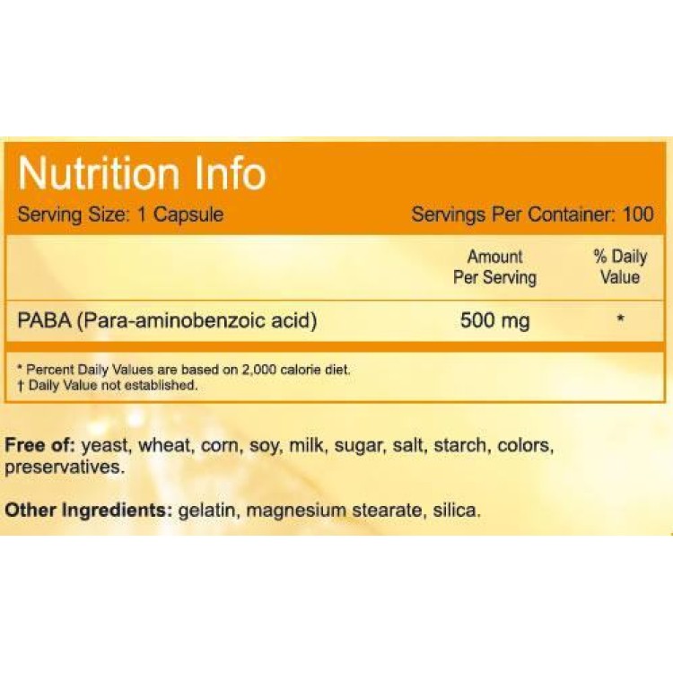 Τo PABA (Para-aminobenzoic Acid) είναι ένα αντιοξειδωτικό που βοηθά στο σχηματισμό των ερυθρών αιμοσφαιρίων. Βοηθά επίσης στη διατήρηση της υγιούς εντερικής χλωρίδας. Ενεργεί ως συνένζυμο στην κατανομή και αξιοποίηση των πρωτεϊνών, για τον αποτελεσματικότερο μεταβολισμό τους, την παραγωγή του φολικού οξέος και την αφομοίωση του παντοθενικού οξέος. Έχει αντιοξειδωτικές ιδιότητες, ενώ απομακρύνει την κούραση από ένα σημαντικό ποσοστό ατόμων.