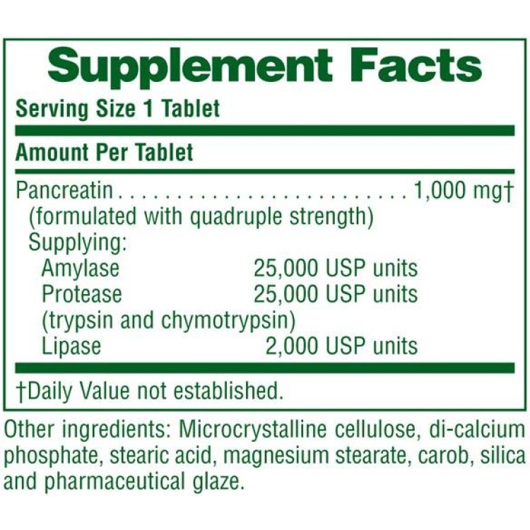 Κάθε ταμπλέτα περιέχει 1000 mg παγκρεατίνης, η οποία παρέχει 2000 usp λιπάσης, 25.000 usp αμυλάσης και 25.000 usp πρωτεάσης (θρυψίνη, χυμοθρυψίνη). Ειδική επικάλυψη της ταμπλέτας, ώστε να ελευθερώνει τα παγκρεατικά ένζυμα κατευθείαν στο λεπτό έντερο. Υποαλλεργικό προϊόν.