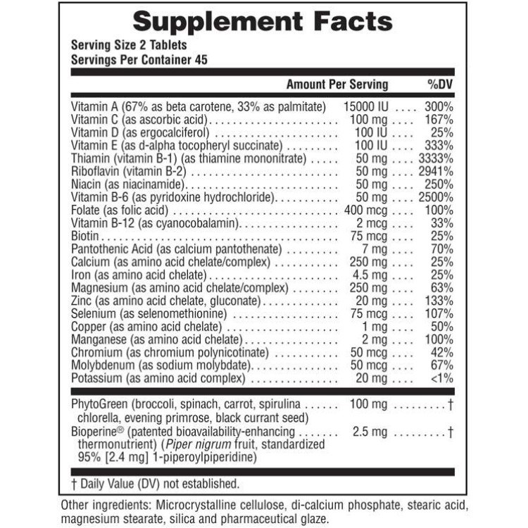 Περιέχει πλήρη σειρά βιταμινών, μετάλλων, ιχνοστοιχείων, βιοπερίνη (για αύξηση της βιοδιαθεσιμότητας), λαχανικά/πράσινα μέρη φυτών: μπρόκολο, καρότο, σπανάκι, σπιρουλίνα, χλορέλα, νυχτολούλουδο, black currant seed. Υποαλλεργικό.