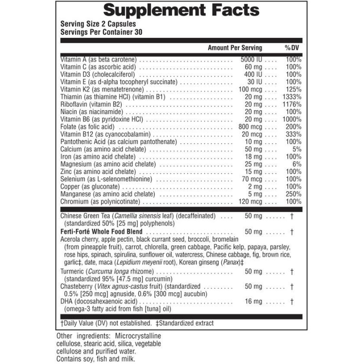 Φυσικό πολυβιταμινούχο συμπλήρωμα ειδικά σχεδιασμένο ώστε να παρέχει τη μέγιστη διατροφική υποστήριξη για τη σωστή λειτουργία του γυναικείου αναπαραγωγικού συστήματος. Συνδυάζει βιταμίνες, μέταλλα, ιχνοστοιχεία, αμινοξέα, ένζυμα, αντιοξειδωτικά και ειδικά βότανα, που βοηθούν στην ομαλή ορμονική λειτουργία και την αύξηση της γονιμότητας.