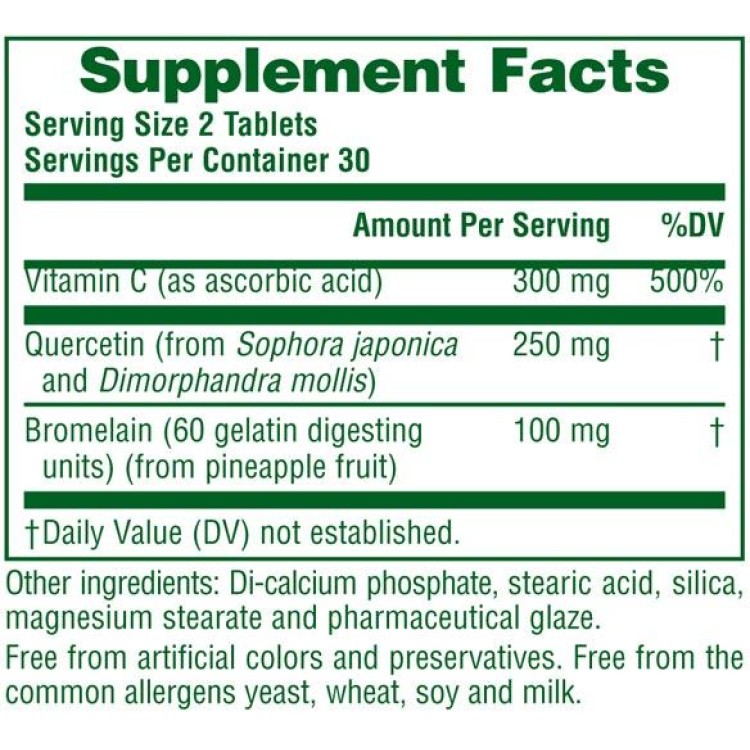 Kάθε υποαλλεργική ταμπλέτα περιέχει 250 mg κουερσετίνης, 300 mg βιταμίνης C και 100 mg βρομελίνης.