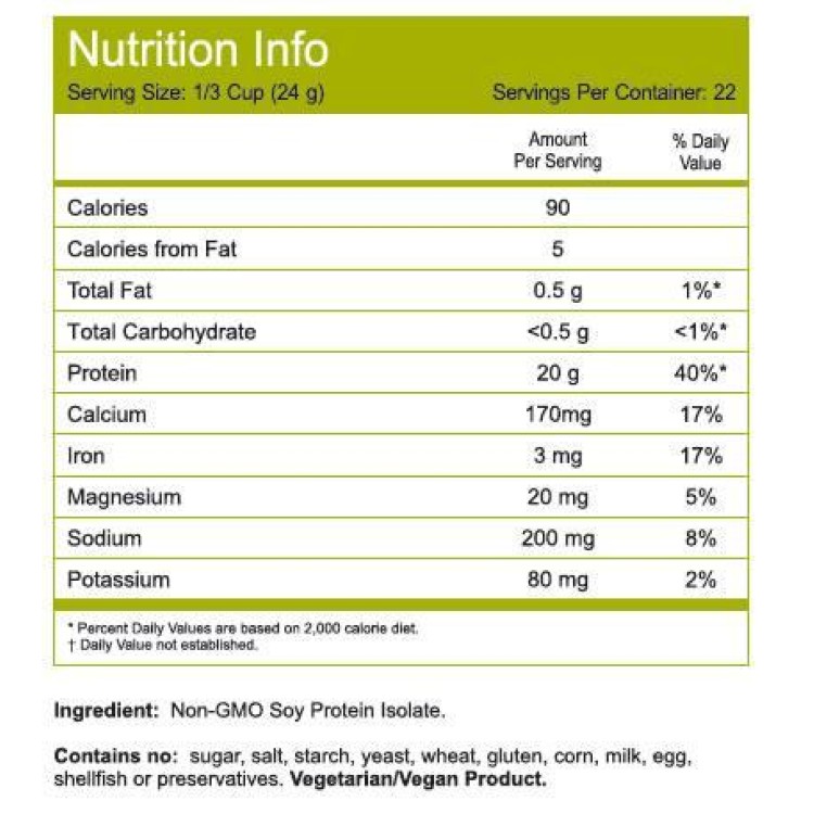 Η Soy Protein δεν περιέχει γλουτένη, σιτάρι, κριθάρι, σίκαλη ή βρώμη και δεν χρησιμοποιούνται χημικές ουσίες κατά τη διαδικασία απόσταξης. Αναμιγνύεται σε ποτά ή shakes, αλλά μπορεί να χρησιμοποιηθεί και στο ψήσιμο. Παρασκευάζεται με τη λήψη απαλλαγμένου από λιπαρά αλευριού σόγιας και την εξάλειψη των μη πρωτεϊνικών τμημάτων, όπως οι υδατάνθρακες και τα λιπαρά. Η Soy Protein είναι ένας ασφαλής και υγιής τρόπος για την καταπολέμηση των κινδύνων της στεφανιαίας νόσου. Μπορεί επίσης να χρησιμοποιηθεί για την πρόληψη της οστεοπόρωσης και των συμπτωμάτων της εμμηνόπαυσης καθώς και για την καταπολέμηση ορισμένων μορφών καρκίνου.