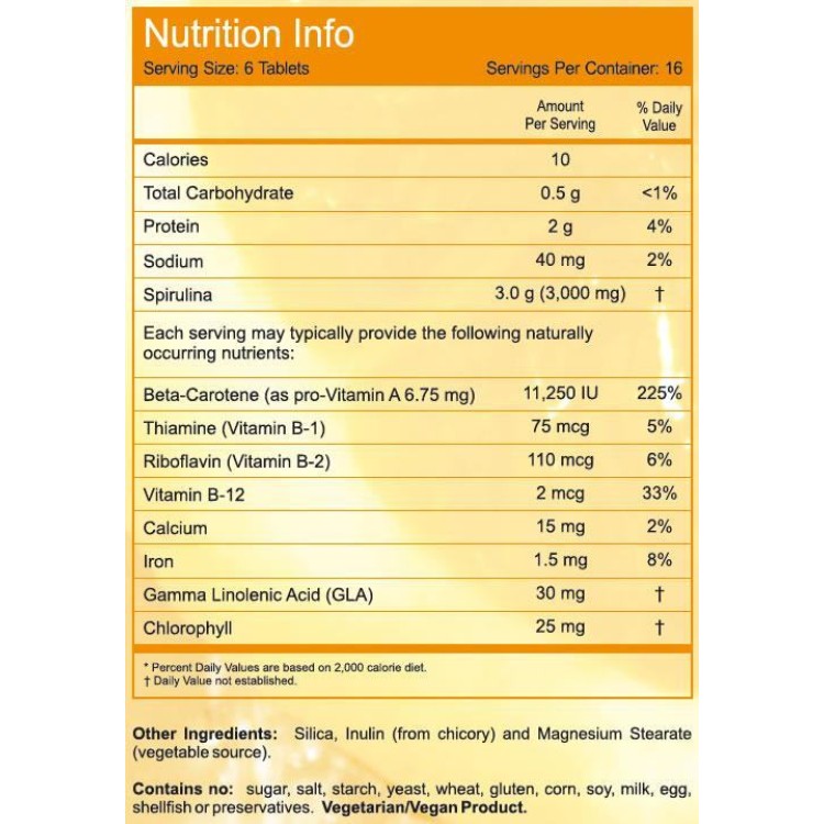 Το NOW® Spirulina 500mg προέρχεται από 100% φυτική μη μεταλλαγμένη Spirulina που καλλιεργείται στη Χαβάη. Τα φυτικά στοιχεία που προσδίδουν το πλούσιο γαλάζιο πράσινο χρώμα ζυτού του άλγους – χλωροφύλλη, φυκοκυανίνη και τη Β-Καροτίνη – βοηθούν το σώμα να καθαρίσει από τις τοξίνες, να απορροφήσει ευκολότερα τις πρωτεΐνες και να ενισχύσει την αντιοξειδωτική δράση αντίστοιχα.