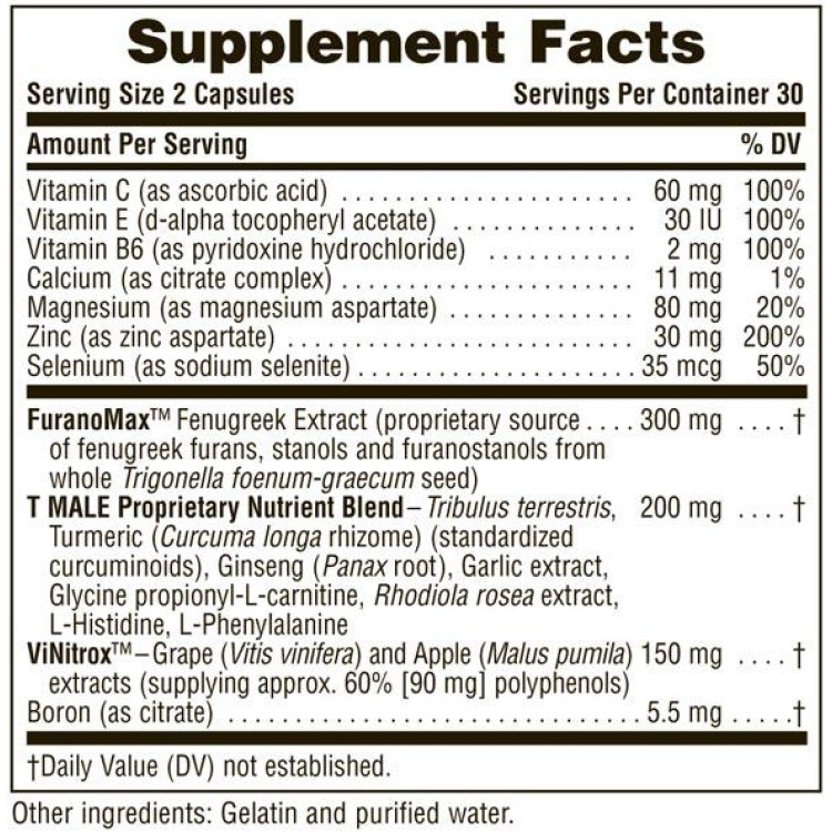 Ιδανικό συμπλήρωμα διατροφής για την αύξηση της ενδογενούς τεστοστερόνης. Συνδυάζει ειδικά διατροφικά συστατικά (βιταμίνες, μέταλλα, ιχνοστοιχεία, αμινοξέα) και βότανα (Fenugreek, Tribulus terrestris κ.ά.) που βελτιώνουν τα χαμηλά επίπεδα τεστοστερόνης, ενισχύοντας έτσι τη σεξουαλική και εγκεφαλική λειτουργία. Για περισσότερη ενέργεια, αντοχή και μυϊκή δύναμη, ενίσχυση του ανοσοποιητικού και καρδιαγγειακού συστήματος. 100% φυσικό προϊόν, χωρίς τις παρενέργειες των αναβολικών στεροειδών.