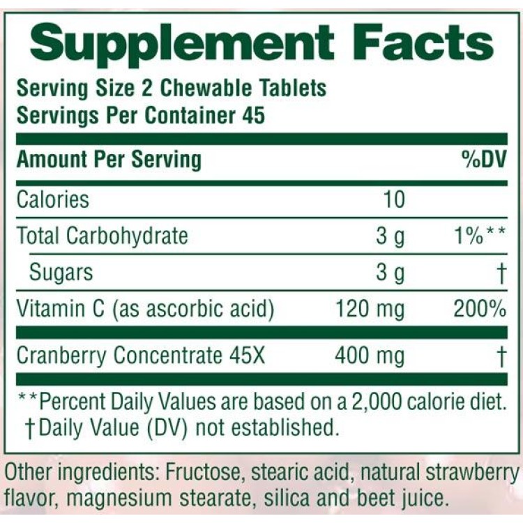 Κάθε μασώμενη ταμπλέτα περιέχει 200 mg συμπυκνωμένο χυμό Cranberry (45:1) και 60 mg βιταμίνης C. Με φυσική γεύση cranberry/ φράουλα. Χωρίς κοινά αλλεργιογόνα (γλουτένη κλπ.).