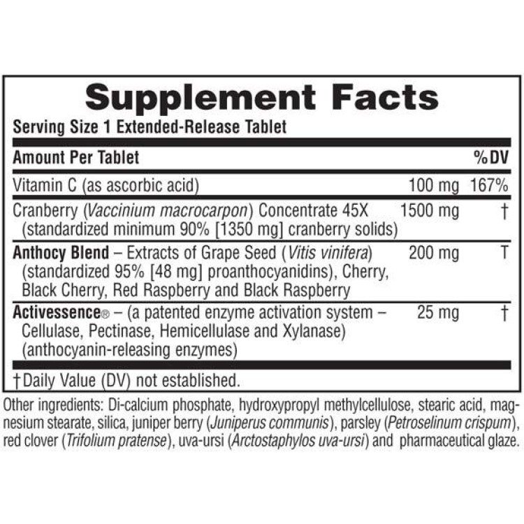 Κάθε ταμπλέτα περιέχει: 1500 mg εκχύλισμα Cranberry (45:1), περιεκτικότητας 90% (1350 mg), κατ’ελάχιστον, σε cranberry solids, 100 mg βιταμίνης C και 200 mg από εκχυλίσματα grape seed (που παρέχει 48 mg προανθοκυανιδινών), cherry, black cherry, red raspberry και black raspberry. Ενισχυμένο με το σύστημα Activessence®.