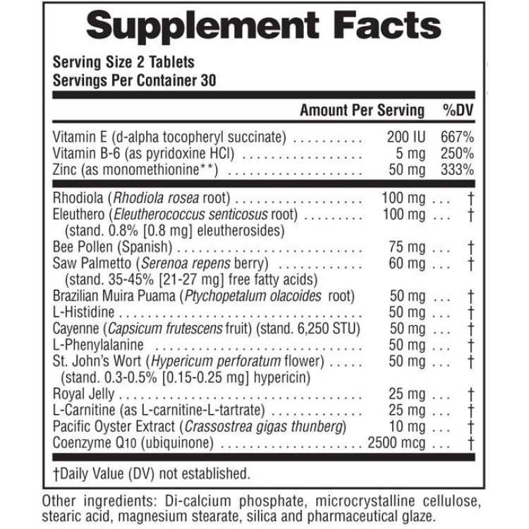 Περιέχει βιταμίνες Ε και Β-6, ψευδάργυρο, σιβηριανό τζίνσενγκ, γύρη μελισσών, saw palmetto, βραζιλιάνικο muira puama, ιστιδίνη, καγιέν, υπέρικο (St. John’s wort), φαινυλαλανίνη, βασιλικό πολτό, καρνιτίνη, εκχύλισμα στρειδιού, CoQ10.