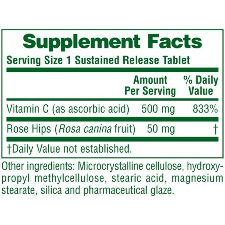 Kάθε ταμπλέτα περιέχει 500 mg βιταμίνη C και 50 mg καρπούς τριαντάφυλλου (rose hips), μία ιδιαίτερα πλούσια πηγή βιταμίνης C. Bαθμιαία αποδέσμευση συστατικών για 40% μεγαλύτερη απορρόφηση. Yποαλλεργική.
